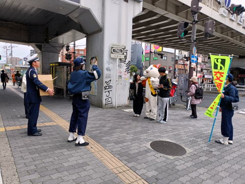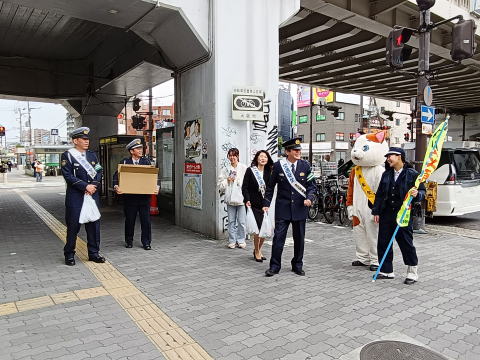 | 春の全国交通安全運動(4/6~15)実施期間中に大正警察署と連携して、大正駅前交差点にて交通安全街頭キャンペーンを実施しました。 会員事業所11社に参加をしていただき、歩行者、特に自転車利用者には青切符の導入等、ちらしとキャンペーングッズを配布して声掛けをしました。 当日は大正警察署交通課の署員また当支部寄贈の猫の着ぐるみ「ポリにゃん」も参加し、松尾支部長、大正警察署長も共にPRをおこないました。 |
